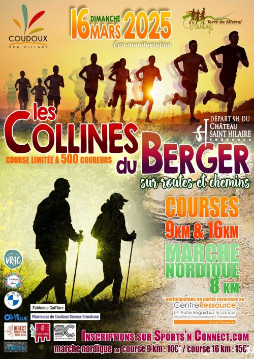 Course pédestre "Les collines du berger. Il s'agit d'une course mixte (routes et chemins) proposant 2 parcours (ELITE 16km et PREMIUM 9km) avec comme points forts la montée des 4 termes et la découverte des sentiers de notre colline aux couleurs typiquement provençales. Notre course est un rendez-vous apprécié par les coureurs licenciés ou non des Bouches-du-Rhône sensibles au caractère convivial de notre organisation. Notre marque de fabrique est notamment la constitution d'un buffet de qualité avec beaucoup de productions maison ainsi que d'un buffet "gastronomique" dans lequel nous mettons en avant les produits locaux. Depuis 8 ans, nous nous inscrivons dans un projet tourné vers plus de solidarité, la participation de 2 goélettes des DUNES DE L'ESPOIR et un partenariat avec une association locale RESSOURCE située aux Milles.
