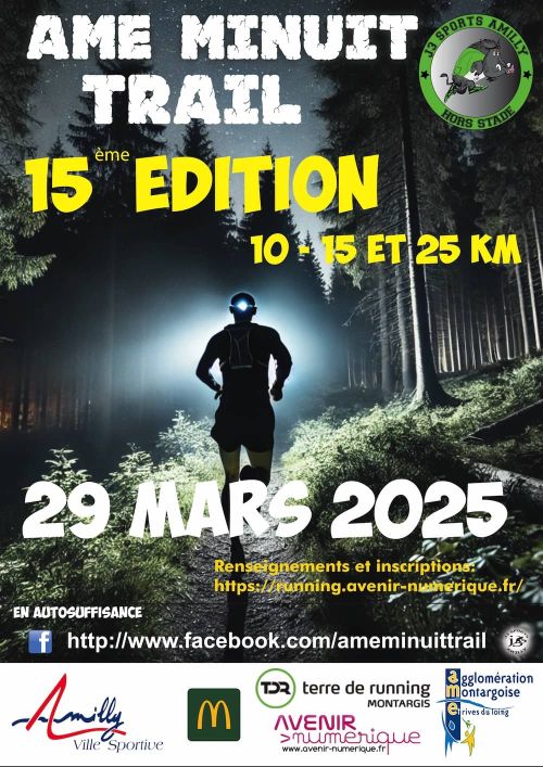 L’AME MINUI TRAIL est une épreuve nocturne de course à pied de 25 kms - 15 kms et 10 kms en autosuffisance, organisée par la section d’Athlétisme des J3 Sports Amilly. Le départ sera donné à 19h30. Aux environs 8 ème kilomètre de la course les participants choisiront la distance qu’ils souhaitent réaliser en s’engageant alors sur le petit parcours (15km) ou sur le long (25km). Un pointage obligatoire sera réalisé à ce moment de la course.
