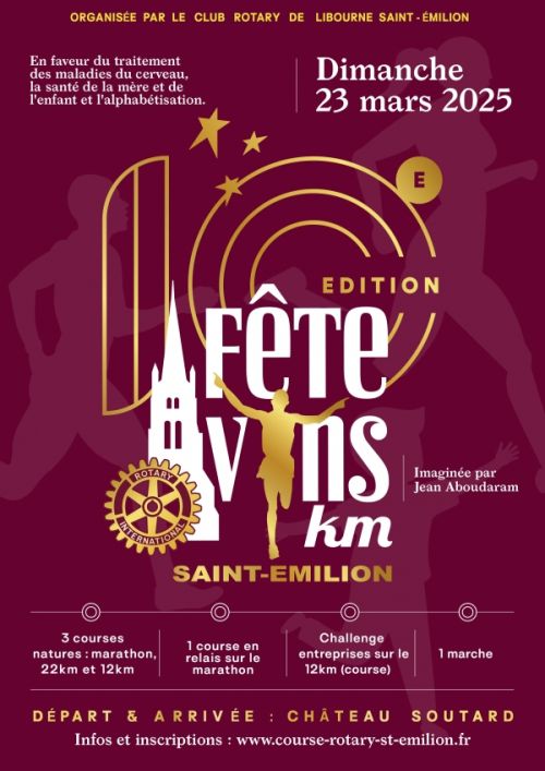 L’événement Les Vins Km de Saint-Emilion a été créé en 2016. Cette course pédestre est pilotée par le Club Rotary Libourne Saint-Emilion et se déroule dans le paysage exceptionnel du premier vignoble inscrit au Patrimoine Mondial de l’UNESCO dont les 20 ans ont été célébrés en 2018. Un parcours nature et vallonné est proposé au coeur du vignoble de Saint-Emilion, avec passage et ravitaillement dans de nombreux châteaux de prestige. Il comprend des routes goudronnées, des allées de calcaire et chemins de terre.