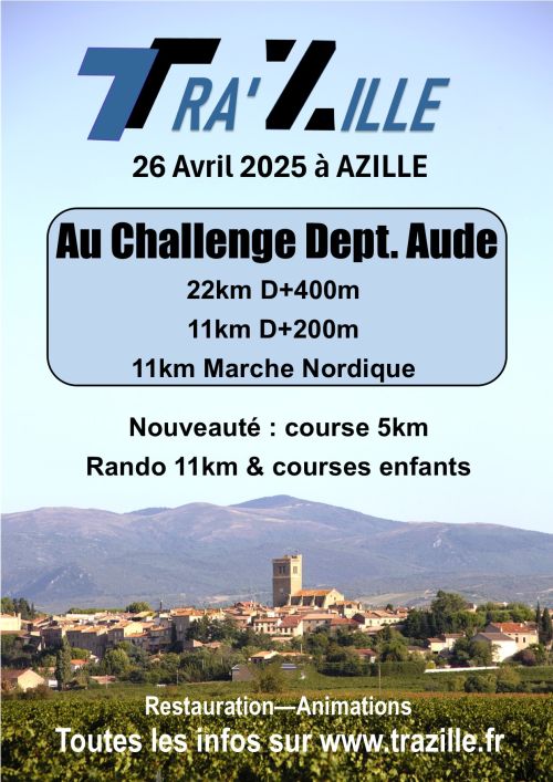 C'est dans l'Aude, en Occitanie, que se dérouleront les épreuves du Trail d'Azille. Au programme : 3 trails, une marche nordique et plusieurs courses pour les enfants seront organisées ! La commune d’Azille est un terrain de jeu idéal pour les coureurs débutants ou confirmés. Avec ses vues imprenables à 360° sur la Montagne Noire, le mont Alaric et les Pyrénées, le Minervois saura conquérir ton cœur de traileur. Les circuits cheminent au milieu des vignes et forêts avoisinantes