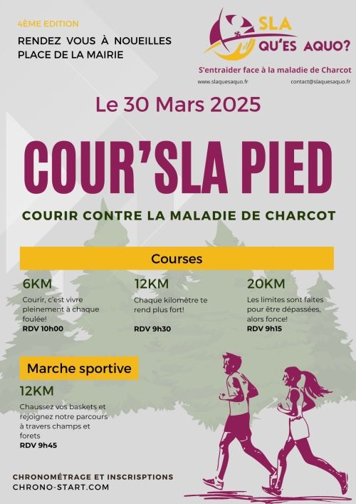 Cour’SLA pied vous propose trois courses sur des distances de 6 , 12 et 20 km en pleine nature, sur les coteaux du Lauragais. Chaque euro récolté participera à la recherche contre la SLA (Maladie de Charcot). Notre association SLA QU’ES AQUO a été créée à l’initiative de malades, d’aidants familiaux et d’auxiliaires de vie Elle a pour objectifs: De soutenir, informer, aider et accompagner les malades et leurs familles dans cette épreuve De soutenir et aider les chercheurs en collectant des fonds pour la recherche clinique et fondamentale.