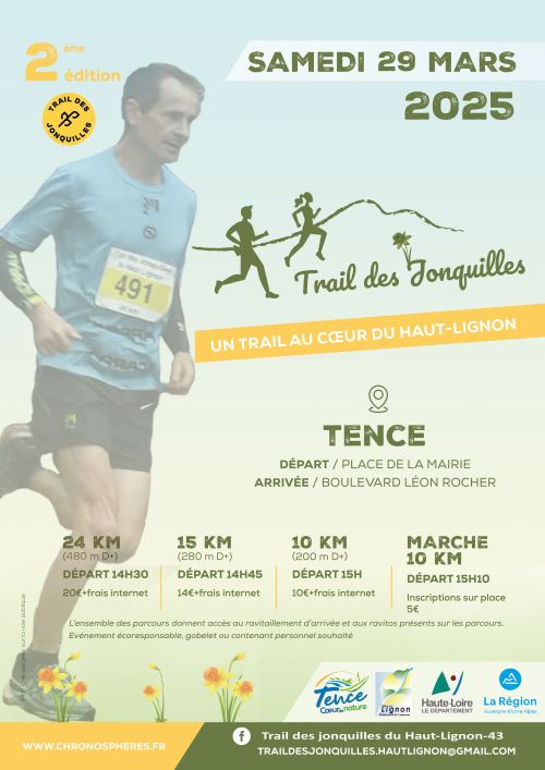 Trail des jonquilles du Haut Lignon avec 3 parcours trail au départ de Tence. Départs: 24kms à 14h30, 15kms à 14h45, 10kms à 15h