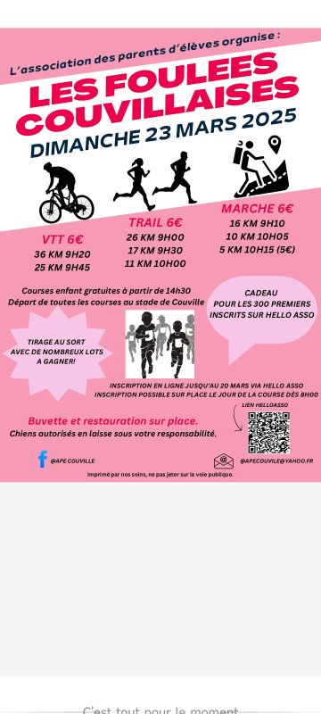 Les foulées Couvillaises sont des épreuves organisées par l’Amicale des Parents d’ Elèves de Couville. L’ensemble des foulées Couvillaises se déroule en circuits, sur les routes communales et les chemins de terre de la commune de Couville, Virandeville, Bricquebosq, Breuville et St Martin le Gréard.