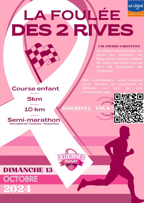 Le club des 2 Rives rugby organise "La foulée des 2 Rives". La majorité des fonds récoltés lors de cet évènement sera reversée à la ligue contre le cancer. Un événement sportif caritatif, plusieurs parcours en marche et/ou en course sont possibles.