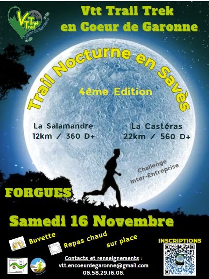 La 4° édition du Trail Nocturne en Savès (TNS) se déroulera le samedi 16 novembre 2024. Une soirée inoubliable au cœur de la forêt communale de Rieumes au départ de Forgues (31370). Pour ceux qui veulent découvrir un trail de nuit, n’hésitez plus et venez tenter l’aventure. Tous ceux qui ont essayé, reviennent 🙏😍. Au cours de la soirée, nous vous proposons deux formats de course permettant à tout le monde de participer. Nous gardons le challenge inter-entreprise (équipe de 3). Après avoir obtenu pour la seconde année consécutive le « Label Eco-responsable », nous renouvelons notre engagement auprès de la Trail Runner Fondation (TRF) afin d’obtenir pour une troisième année consécutive, le Label de Trail Eco-Responsable : parcours propres, balisage réutilisable… tout ce qui est bon pour notre forêt. Le TNS, ce sont des bénévoles au top et une association sous le nom de VTT en Cœur de Garonne constituée de 3 sections (VTT, Trail et Trek), qui s’entoure d’une cinquantaine d’adhérents. Alors n’attendez plus et venez prendre le départ pour une course inoubliable, pleine de surprises, à but caritatif et alliant sport et bonne humeur . Une partie des bénéfices sera reversée à la ligue pour le dépistage des cancers via un de nos adhérents qui effectue la Vélodyssée 2024, vous trouverez toutes les infos sur le suivi facebook : https://www.facebook.com/profile.php?id=61554961509919