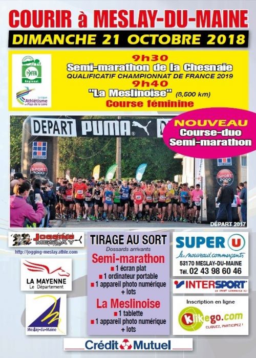 Semi-marathon de Meslay du Maine : 14ème édition, labelisé et qualificatif au championnat de France. Circuit en 3 boucles distinctes (1,500 km + 7,500 km + 12,100 km) vers les villages de St Denis du Maine et Arquenay, le tour de la base nautique de la Chesnaie et le sentier pièton en sable dur pour revenir à Meslay du Maine. Pas de difficultés majeures, faux-plat de 600m avant le 16ème km. Nouveautés possibilités de courir en DUO le semi-marathon : 9km pour le premier relayeur et 12.1km pour le second.