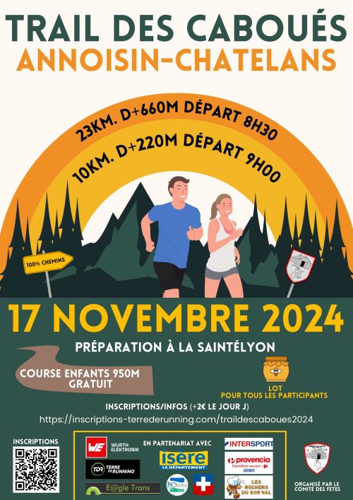 Public · Tout le monde sur ou en dehors de Facebook 🎉 Trail des Caboués - 17 novembre 2024 🎉 Rendez-vous pour une journée sportive inoubliable au cœur de la nature! 🌲🏃♂️ 📍 Lieu : salle des 4 vents ⏰ Heure de départ :A partir de 8h30 🔥 Au programme : • Parcours variés pour tous les niveaux. • Panorama exceptionnel à découvrir sur des sentiers sauvages. • Ambiance conviviale avec ravitaillements, animations, et bien plus encore ! 🏅 Inscriptions ouvertes dès maintenant ! N’attendez plus pour réserver votre dossard. 👉 Plus d’infos et inscriptions sur : https://inscriptions-terrederunning.com/traildescaboues2024 Venez relever le défi et partager une expérience unique entre passionnés de trail !