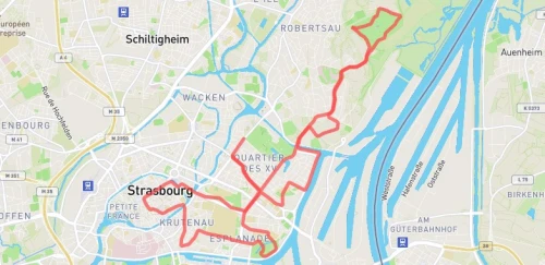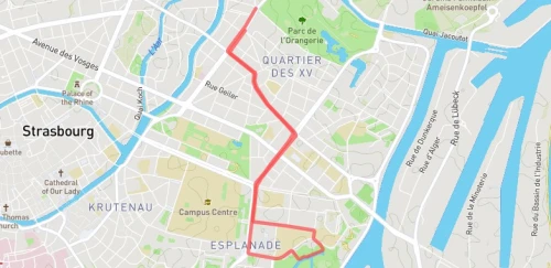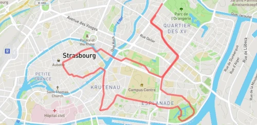 Avec le départ et l'arrivée à proximité du Conseil de l'Europe de Strasbourg, le 5km emprunte les boulevards à proximité du parc de l'Orangerie.