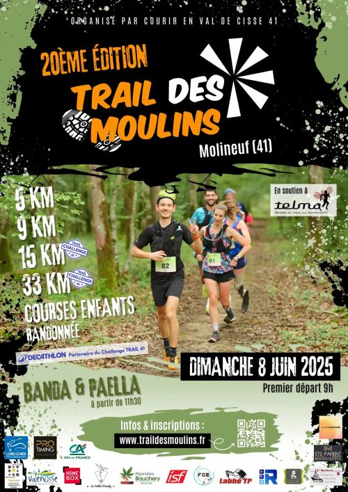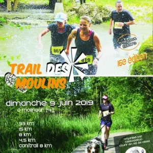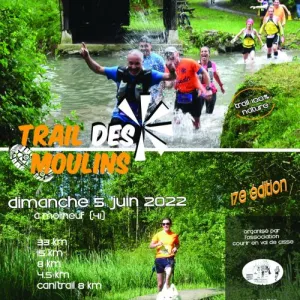 Le Trail des Moulins pour laquelle tous les parcours sont modifiés. Des parcours de 33 km, 15km et 8 km permettent selon les niveaux de chacun de parcourir le cadre idyllique vallonné à souhait où la Cisse, ses moulins, ses châteaux rendent encore plus majestueuses les courses. A partir de cette édition anniversaire, nous invitons nos amis les chiens à courir avec nous sur le Cani’Trail de 8km.