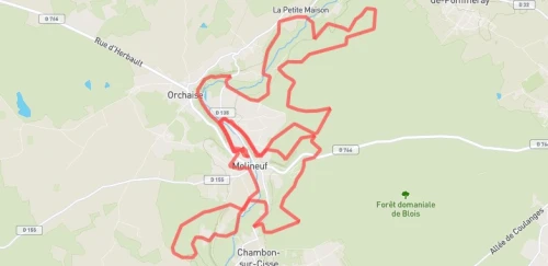 Départ depuis le parc du moulin des Charmes tout en longeant la Cisse puis première montée en douceur pour accéder au carmel avant d'entré en fôret de Blois. Mono trace en sous bois très vallonné pour revenir sur le parc du moulin des Charmes avant d'emprunter la boucle de 15kms qui vous fera passer par l'église St Secondin,longer la cisse près du château de la Poterie avant de traverser la Cisse pour accéder aux Rinçeaux ( Marécage traversée sur ponton) et attaquer les difficultés. Retour sur le parc du moulins des charmes après passage dans l'eau au Gué Taureau.
