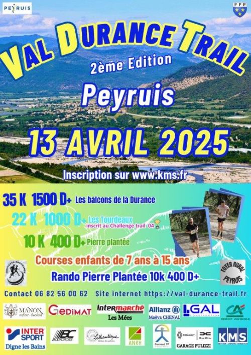 La section trail du foyer rural de Peyruis avec la collaboration du Club Pénitent en Durance des Mées organisent la 2ème édition du Val Durance Trail le 13 avril 2025 à Peyruis (04). Elle vous propose à travers ses trois parcours « Pierre Plantée » 11 kms 380 D+, « Toudeaux » 22kms 920 D+ et « Balcons de la Durance » 35km 1480D+ de venir profiter de son beau terrain de jeu. Vous y découvrirez nos patrimoines comme la chapelle Saint Donnat et la chapelle d’Augès (22 et 35 km) et sur des sentiers en balcon vous aurez en visuel la montagne de Lure, les sommets bas alpins, le Cousson, la crête des dourbes, cheval blanc et bien plus encore mais surtout un panorama 360° sur le Val de la Durance avec en fond les pénitents des Mées.