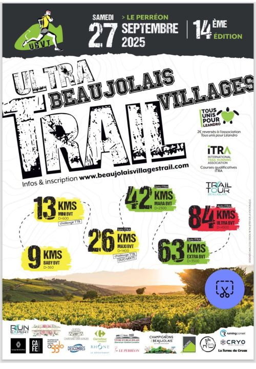 L'association Ultra Beaujolais Villages Trail vous accueille au cœur du Beaujolais dans le petit village du Perréon. 5 épreuves pour satisfaire le plus grand nombre, de 7 à 77 ans, de 500m jusqu'à 80 km ! Les parcours vous entraîneront à travers vignobles, crêtes, forêts, landes et villages pittoresques du Beaujolais sur une grande variété de chemins. De superbes panoramas s'offriront sans cesse aux coureurs et une soirée festive en musique autour d'un repas local viendra clore la journée !