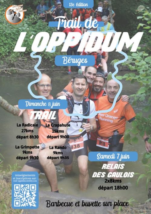 L'association Béruges Sport Nature et ses nombreux bénévoles vous invitent à participer au Trail de l'Oppidum. Venez courir sur les pas des Gaulois, au coeur de la vallée de la Boivre. Comme l'année passée, trois parcours seront proposés.