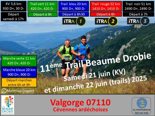4 trails en boucle au départ de Valgorge (07110) situé dans les Cévennes ardéchoises, essentiellement sur sentiers et pistes dans les massifs de Prataubérat et du Tanargue. Depuis 2024, un KV (Kilomètre Vertical) est proposé, il aura lieu le samedi 21 juin à 17h. Les parcours trail de 11km et 20km sont ouverts aux randonneurs.