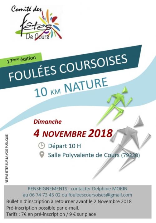 Les Foulées Coursoises sont organisées par le Comité des Fêtes de Cours. La course est ouverte à toute personne, licenciée ou non. Les mineurs (à partir de 16 ans) devront avoir une autorisation parentale.