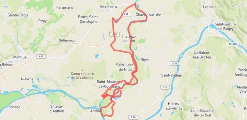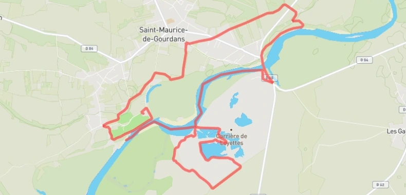 Le circuit VTT est un parcours de 22 km entre le stade Régis Perrin à Saint-Maurice de Gourdans jusqu’au Pont de Chazey . Le parcours emprunte à 80% des chemins agricoles et sentiers et 20% de route vicinale communale et départementale .Dénivelé + : 101 mètres altitude min 191 mètre max 235 mètres Le circuit traverse la commune de Saint Maurice de Gourdans puis longe la rivière d’Ain et les vorgines jusqu’à ST Jean Niost avant de retourner sur la plaine de l’Ain à travers des voies Agricoles principalement jusqu’à Pont de Chazey Le circuit est sécurisé par des signaleurs à chaque entrée de portion route et fin de section route et à chaque croisement de route . La première partie du parcours VTT se déroule sur les bords de la rivière d’Ain et notamment les Vorgines il est donc strictement interdit de rouler en dehors du chemin et de laisser des déchets.