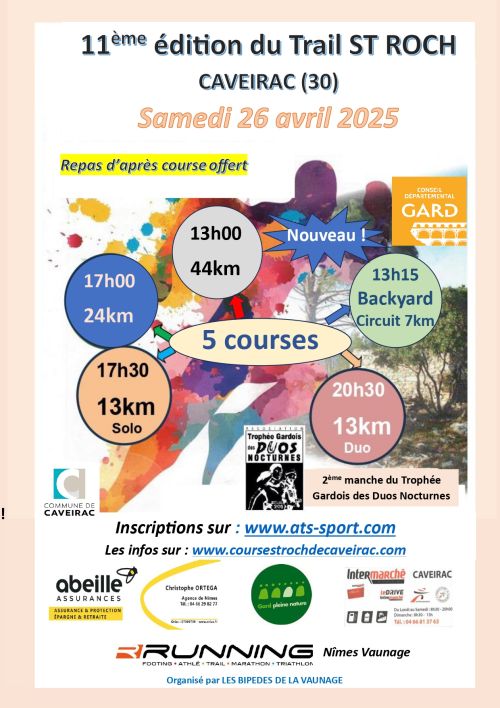 Cette année, le trail s’étoffe avec 2 nouvelles épreuves chronométrées : (85% des parcours ci-dessous se dérouleront en garrigue sur sentiers monotraces ou chemins forestiers). • Un trail longue distance de 44 km (1000m D+) qui reprendra le parcours du 24km auquel s’ajoutera une boucle sur les communes voisines de Clarensac et St Cômes ouvert à partir de la catégorie ESPOIR - Départ 13h00 • Un BACKYARD épreuve particulière qui fait appel à l’endurance, puisqu’il s’agit d’une course par élimination sur un parcours de 7km (190m D+) à faire en moins d’1heure pour être qualifié pour le départ suivant. (limitée à 8 heures); - ouvert à partir de la catégorie ESPOIRr _1er Départ à 13h15 A ces 2 nouvelles courses s’ajouteront celles des années précédentes : • un Trail découverte de 13km,en solo, ouvert à partir de la catégorie CADET (16/17 ans) dénivelé 290 mD+. (départ 17h30) • une Trail court de 24 km, en solo ouverte à partir de la catégorie JUNIOR (18/19 ans) dénivelé 490 mD+ (départ 17h00) • un Duo Nocturne de 13 km ouvert à partir de la catégorie CADETt (16/17 ans) - Parcours identique à la course solo.(20h30) Ce duo est la 2ème manche du Trophée Gardois des Duos Nocturnes 2025
