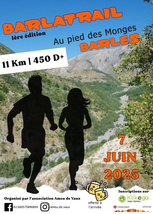 Ce trail de 11 kilomètres vous emmènera sur des sentiers pittoresques autour du charmant village de Barles, offrant des panoramas spectaculaires sur les montagnes environnantes, les forêts de pins et les formations rocheuses uniques de la région. Accessible à tous les niveaux, le Barlatrail est une aventure idéale pour les amoureux de la nature et les coureurs souhaitant allier défi sportif et découverte d'un patrimoine naturel exceptionnel.