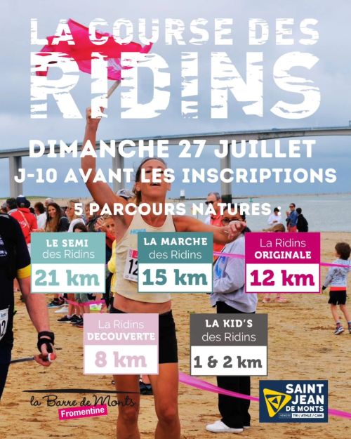 La Course des ridins, une course 100% Nature, 100% conviviale ! Les différents parcours permettront aux concurrents de découvrir les lieux remarquables de Fromentine : la forêt, le Pey de la Blet, des chemins en sous-bois et des sentiers côtiers et bien évidemment la magie de cette course est de venir fouler les ridins au pied du pont de Noirmoutier
