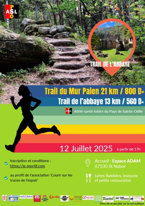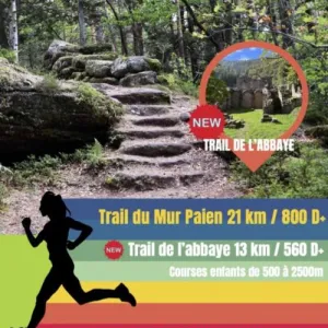 Course originale, effectuée sur des sentiers qui vous ferons découvrir le Mur Païen. Le parcours vous emmènera de Saint Nabor à la Bloss puis au Kinberg et la partie sud du Mur Païen pour arriver au mont Sainte Odile. Retour par le sentier des Pèlerins pour retour à Saint Nabor. Il vous restera à redescendre vers la ligne d’arrivée.