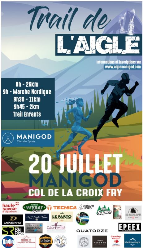 Magnifique parcours nature dans les Aravis avec une ambiance conviviale. Les épreuves sportives des Trails de l'Aigle et de La Marche Nordique de l'Aigle sont organisées par le Club des Sports de Manigod. Toutes les épreuves sont au départ du col de la Croix-Fry, à Manigod.