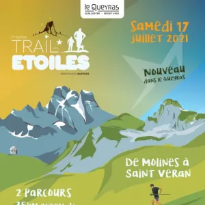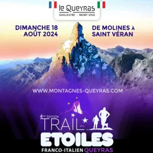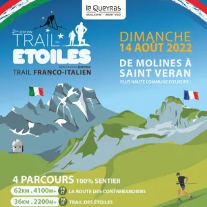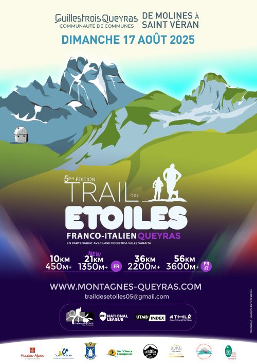 Retrouvez le Trail des Etoiles entre Molines et Saint Véran dans le Queyras ! Le Trail des Etoiles 36km 2200m+ par le splendide tour de la Tête des Toillies, ses cols à 3000m et ses lacs d'altitudes puis l'enchainement Col Saint Véran & Pic de Caramantran. La Route des Contrebandiers avec sa très sauvage trace franco-italienne par le pic de Caramantran 3006m et la vue plein cadre sur le roi de pierre le Mont Viso, son ravito montagnard dans le village tout en pierre de Chianale et la remontée vers les lacs de longet. Egalement au programme une course sprint (10km 450m+) et un nouveau parcours typé pure montagne "Le Semi du Rasis avec 21km et 1350m dans un cadre exceptionnel. Les arrivées sont jugées au coeur de la plus haute commune d'Europe à Saint Véran!
