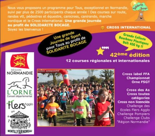 Le CROSS International de MONTILLY SUR NOIREAU est le rendez vous Sportif et caritatif de Toute la famille en Basse Normandie. Au travers du bocage et de la Suisse Normande, sur une terre de sport et de nature au cœur de la Basse Normandie, un programme diversifié de randonnées VTT, pédestres et équestre, marche nordique, cani rando, canicross, cross country et courses sur route suivi par plus de 2500 participants venus d’une quinzaine de départements et plusieurs nations vous est proposé.