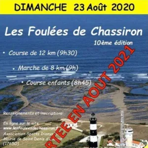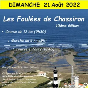 Les Foulées de Chassiron est une course avec un tracé exceptionnel qui passe par la pointe nord de l’île au pied du Phare de Chassiron, le long des falaises, à travers les vignes, et sur la plage, juste avant l’arrivée mais aussi à son ambiance conviviale et aux encouragements que coureurs reçoivent tout au long du parcours. Le départ de la course est précédé d’une course pour enfants, gratuite de 1, 5 km (sans classement) et d’une marche de 8 km
