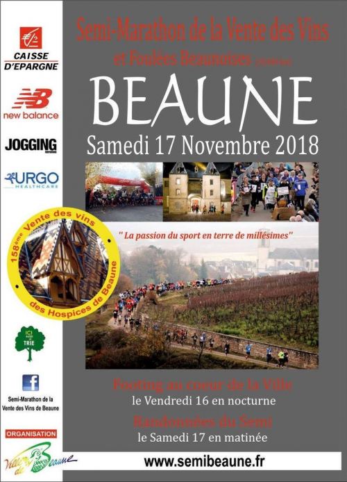 Fort de ses éditions précédentes, le Semi-marathon de la Vente des Vins de Beaune est devenu au fil des ans un événement sportif et un rendez-vous incontournable pour de nombreux coureurs régionaux, mais également nationaux et internationaux. Chaque année, plus de 4000 participants, venant principalement des régions Bourgogne, Franche-Comté, Ile de France et Rhône-Alpes, s’élancent sur le parcours athlétique du Semi (21,100 Kms). Le Semi-marathon de la vente des Vins des Hospices de Beaune emprunte les routes vallonnées et typiques des vignobles de la Côte de Beaune. Les coureurs traversent les lieux et les villages les plus prestigieux de Bourgogne (Pommard, Meursault, Volnay) et le départ se situe juste à proximité des célèbres Hospices de Beaune. La beauté et la renommée des sites traversés se marient à la convivialité et à l’ambiance folklorique de cette manifestation. Plusieurs animations musicales et dégustations de produits du terroir agrémentent la course tout le long du parcours. L’arrivée se situe juste au pied de la Montagne de Beaune (Forum des Sports). L’Organisation met un point d’honneur à assurer à chaque coureur, un accueil chaleureux, un circuit impeccable et sécurisé, des ravitaillements de qualité et de nombreux lots à l’arrivée (1 bouteille à tous + 1 sac Urgo santé + 1 bouteille d'eau + barres énergétiques + bon pour 1 boisson chaude et divers lots). Cat. autorisées JU->V5.