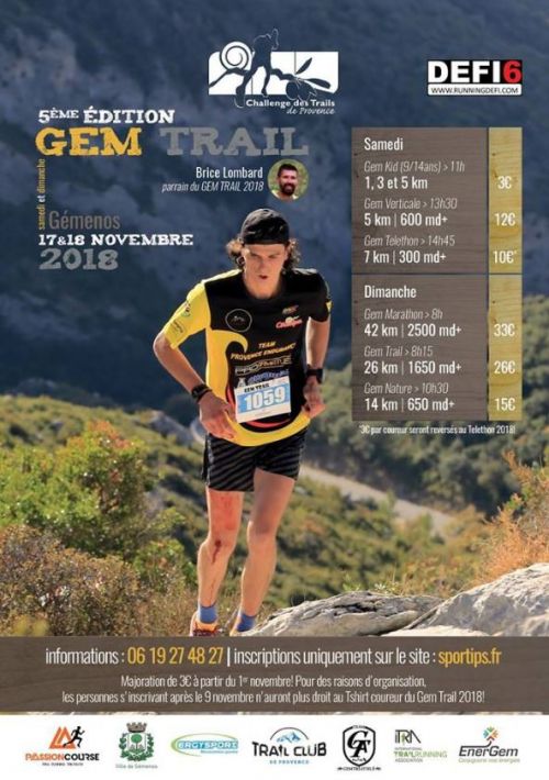 Le Gémenos Tri Athlé et le Trail Club de Provence vous proposent un petit bijou de Trail 100% sauvage, 100% authentique, au départ du village de Gémenos ! Un événement à ne manquer sous aucun prétexte ! Les dossards seront retirés le samedi 18 novembre à partir de 11h pour les courses du jour (Gem Kid & Gem Verticale), et de 14h3 à 18h ainsi que Dimanche 19 à partir de 7h sur place, à Gémenos (Gem Nature, Gem Trail & Gem Marathon).