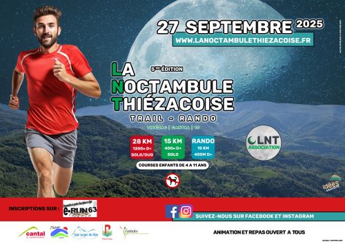 La Noctambule Thiézacoise, course semi-nocturne à Thiézac, dans le Cantal, propose des trails de 15 km et 28 km, une randonnée familiale et des courses pour enfants. Le parcours traverse les paysages vallonnés de la région, entre bois, pâtures et villages authentiques, offrant une expérience nature au cœur de l’Auvergne. Rejoignez l’événement pour une soirée conviviale et sportive, avec un repas chaleureux à partager. Inscrivez-vous et vivez l’aventure !