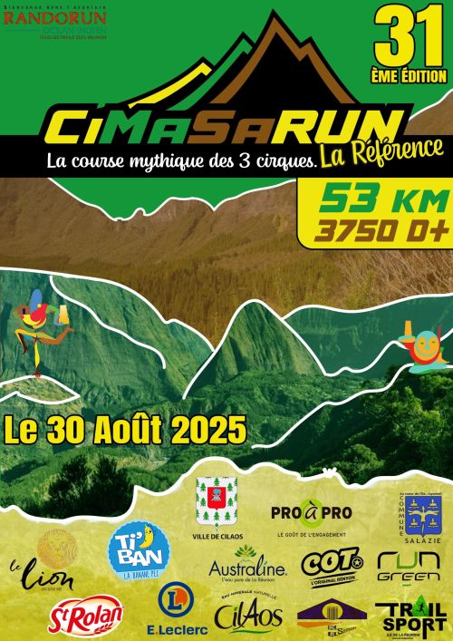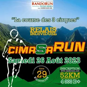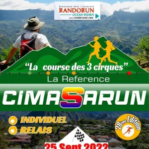 La Cimasarun, la Course des 3 Cirques, est une course de montagne, qui fait parti du patrimoine de La Réunion. 26 ans d’existence ! Très exigeante et merveilleuse par tous les paysages traversés. Ni plus ni moins que les 3 Cirques de La Réunion, avec le Piton des Neiges au centre, unique ! Pour varier les plaisirs et les difficultés, le départ se fait soit à Cilaos ou à Hell Bourg.