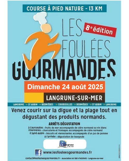 Une course à pied nature et ludique de 13 km, qui associe sport et dégustations. La course "Les Foulées Gourmandes" vous fera découvrir sportivement la Côte de Nacre tout en dégustant des produits régionaux. Le parcours emprunte alternativement l'estran, les digues promenades, les plages, chemin pédestre et sentier littoral, en passant par les communes de Langrune-sur-mer, Saint-Aubin-sur-mer, Bernières-sur-mer, et Courseulles-sur-mer et avec un retour par ces mêmes communes.