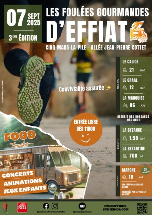 Nous vous invitons à vivre une journée intense aves les Foulées Gourmandes d'Effiat organisées sur deux temps forts : une matinée running avec 5 courses dont 2 parcours enfants, suivie d’un après-midi plus gustatif ouvert à tous dès 11h avec un festival de foodtrucks, des animations pour petits et grands ainsi que des concerts de 13h à 16h. Venez découvrir notre belle campagne cinq-marsienne grâce à nos parcours diversifiés