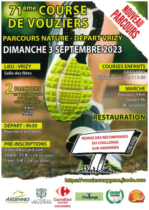 La Course de Vouziers, prévue à Vouziers dans les Ardennes, propose une expérience de trail à travers des paysages vallonnés et verdoyants. Les parcours de 5, 9 et 14 km, adaptés à tous les niveaux, serpentent sur des sentiers non pavés au cœur de la nature du Grand Est. Une randonnée de 9 km et des courses pour enfants sont également au programme. Rejoignez cet événement convivial pour découvrir la beauté sauvage des Ardennes en courant ou en marchant.