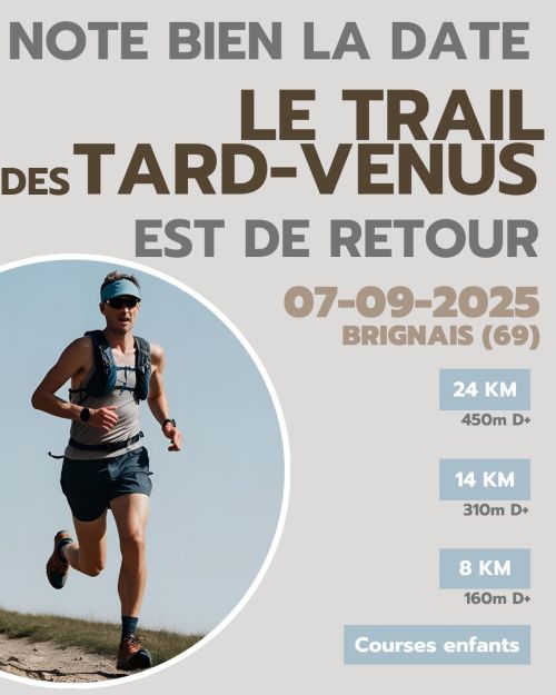 Le Trail des Tard-Venus, organisé par le Raids Eurosportifs de Brignais, est une course nature se déroulant sur chemins, sentiers et quelques portions goudronnées. Il se compose de plusieurs épreuves afin d’accueillir tous types de coureurs, de tous âges.