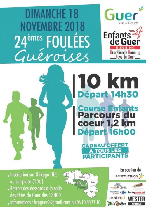 Course des 10 km - Trois tours du traditionnel circuit dans le centre ville de Guer. A 16h, course des enfants (1,2 km) au profit du Téléthon. Médaille et diplôme à tous les participants - Inscription sur place (1€) Epreuve ouverte à tous à partir de la catégorie cadets/cadettes (né(e)s en 2002-2003 - Pour les mineurs : autorisation d'un tuteur légal obligatoire.