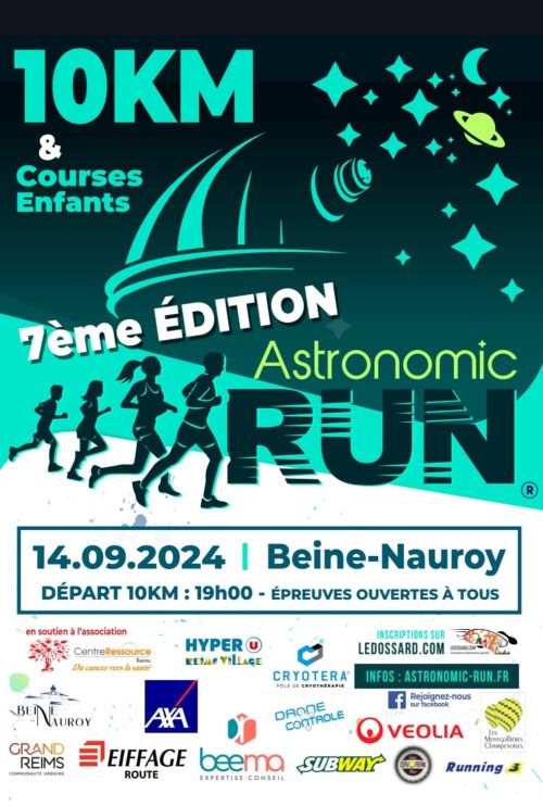 L'Astronomic Run est une course conviviale et solidaire au coeur du village de Beine-Nauroy, à proximité de son observatoire astronomique. Catégories autorisées CA->V5.