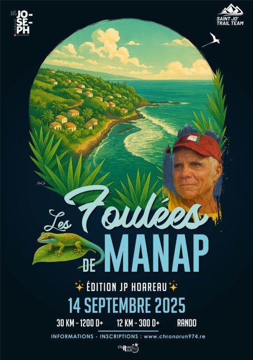 Les Foulées de Manap, organisées à Saint-Joseph, sur l’île de La Réunion, proposent un trail de 30 km (1200 m D+) et un format court de 12 km (300 m D+), ainsi qu’une randonnée de 12 km. Les parcours, démarrant près du Bassin de Manapany, traversent les hauts de la commune jusqu’à la Plaine des Grègues, mêlant bitume, sentiers monotraces et chemins. Les coureurs découvriront des paysages variés, entre végétation luxuriante et panoramas sur l’océan. Participez pour une expérience sportive et immersive au cœur de la nature réunionnaise.