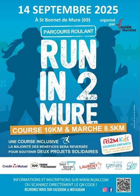 La Foulée Muroise est le club organisateur de la course « RUN IN 2 MURE » qui se déroule dans les communes de Saint Bonnet de Mure, Saint Laurent de Mure et Genas. RUN IN 2 MURE se compose de 2 courses principales : 10km et semi-marathon. Les parcours du 10km et du semi-marathon ont fait l’objet d’un métrage précis mesuré par l’organisation. Le parcours n’est pas ouvert aux randonneurs et/ou marcheurs. Une course enfants (non chronométrée) est proposée avec des distances de 1km et 1,8Km.