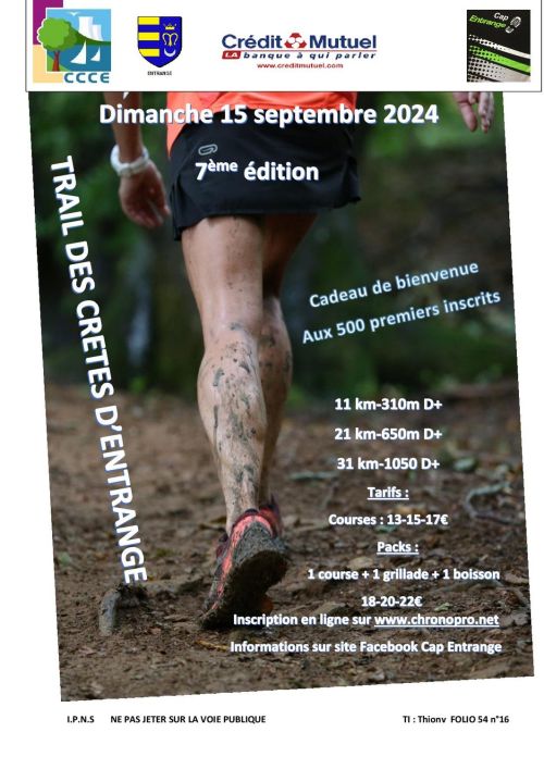 Le Trail des Crêtes d'Entrange se déroule à Entrange, en Moselle, près de Thionville, dans un cadre naturel au cœur de la Lorraine. Les parcours de 11, 21 et 31 km traversent forêts, singles et terrains variés, offrant des vues sur les paysages vallonnés et les villages environnants comme Kanfen et Volmeranges-les-Mines. Avec des dénivelés de 350 à 1000 m, cette course en semi-autonomie propose une expérience accessible à tous les niveaux. Inscrivez-vous pour découvrir ce trail convivial et ses sentiers préservés !
