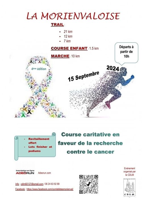 La Morienvaloise, course caritative en faveur de la recherche contre le cancer. Trail de 12 km avec environ 150 m de dénivelé. course composée de chemin, de bois et de route sur la commune de Morienval.