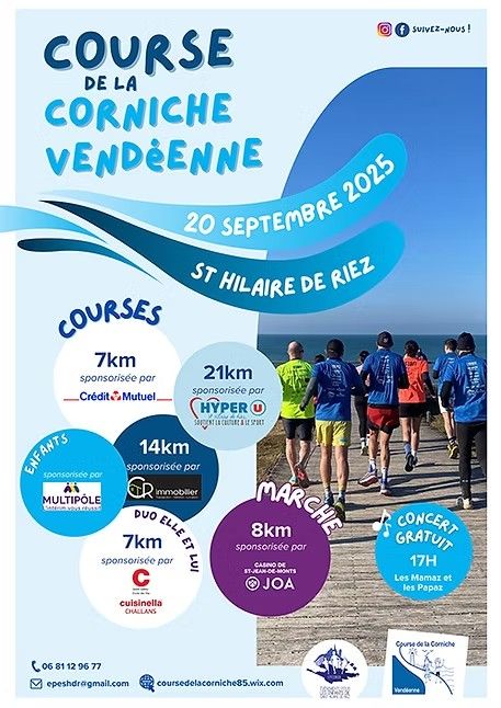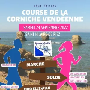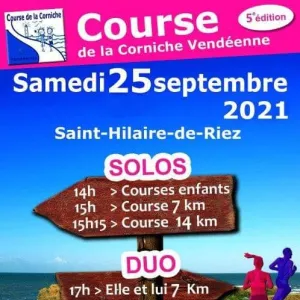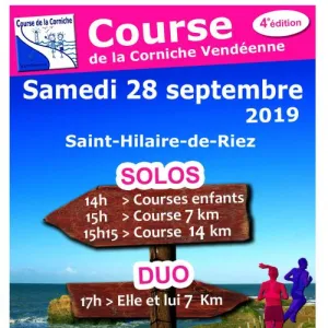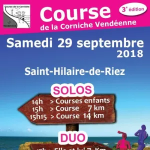 La course de la Corniche Vendéenne est organisée bénévolement par les membres de l'APE des écoles de Sion sur l'Océan en partenariat avec le "Jogging Club de Saint-Hilaire". Forte des deux premières éditions qui ont rencontré un vif succès et de retours très enthousiastes de la part de participants, la Course de la Corniche Vendéenne vous donne rendez-vous pour une nouvelle édition avec 4 courses : 7 et 14 km, "enfants" et "elle et lui" sur un parcours doté d'un panoramique exceptionnel.