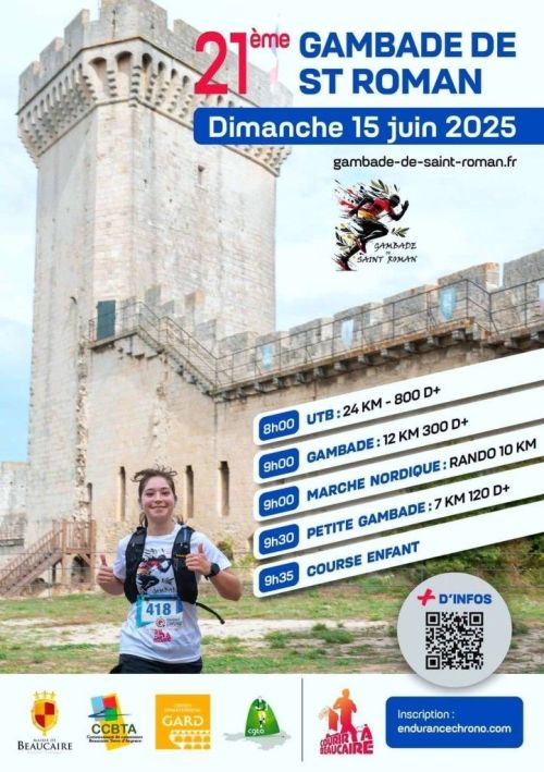 La Gambade de Saint Roman avec un parcours nature chemin et monotraces. Passages devant l'abbaye troglodyte de St Roman unique en Europe. 2 ravitaillements parcours - 1 ravitaillement arrivée. 100% nature parcours sélectif de 25 kms avec un D+ de 800m autosuffisance 1 seul ravitaillement au 11 km,. Traversée du château fort, passage au pied de L'abbaye de St Roman