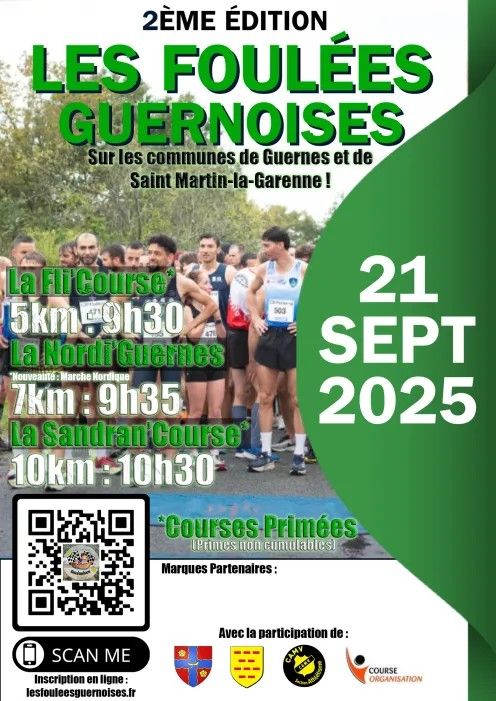 Les Foulées Guernoises est une course à pied organisée à Guernes, un village situé dans les Yvelines, en région parisienne. Le parcours serpente à travers des paysages ruraux typiques de l'Île-de-France, mêlant chemins de campagne, sentiers boisés et vues sur la campagne environnante. Rejoignez-nous pour cette épreuve accessible à tous les niveaux, une occasion de découvrir ce coin de verdure en courant.