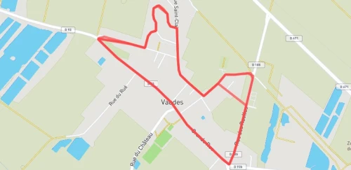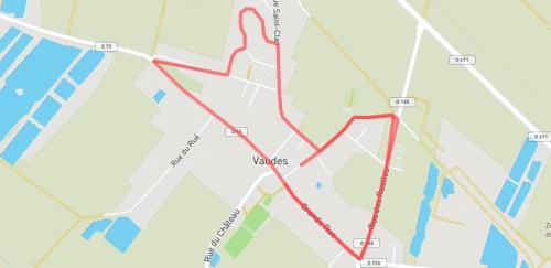 Parcours de 2 boucles qualificatif pour les championnats de France, 1ère petite boucle (flèches bleues), 2ème boucle (flèches rouges) sur terrain plat, uniquement sur route. Départ ruelle Blanchard, arrivée face à la Mairie de Vaudes à gauche de la route.