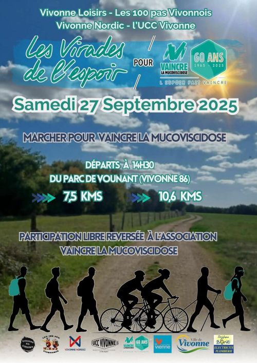 Les Virades de l’Espoir à Vivonne, organisées par Vivonne Loisirs 86, est une course solidaire au profit de l’association Vaincre la Mucoviscidose. Située dans la Vienne, à 20 km de Poitiers, Vivonne offre un cadre verdoyant avec des parcours traversant chemins bucoliques et villages pittoresques. Les coureurs peuvent choisir entre 7,5 km ou 15 km, tandis qu’une randonnée et des courses enfants sont aussi proposées. Venez courir ou marcher dans une ambiance conviviale pour soutenir une cause essentielle.