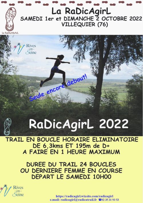 La RaDicAgirl, trail réservé aux féminines, unique en France Trail par élimination horaire sur un circuit de 7,1kms à boucler en 60 minutes maximum. Durée max 24 boucles ou dernière femme en course