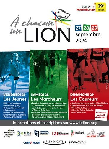 Le Semi-Marathon International du Lion emmènera les coureurs de Belfort vers Montbéliard. le sens est inversé chaque année. L’année passée, plus de 4500 coureurs ont participé au 10 Km, à la Féline sur 5km, au semi-Marathon, aux courses en joëlette et au mini-Lion. Les horaires, 8h45 : La Féline chronométrée uniquement féminin, 8h50 : La Féline mixte non chronométrée, départ de Vieux Charmont, 9h30 : 10 Km au départ de Châtenois Les Forges, 10h00 : semi-marathon international au départ de Belfort, record à 59'53", 9h15 et 9h45 : 10km et semi marathon en joëlette. L'événement se déroulera dans une ambiance de fête, 8 orchestres animeront les 10 derniers km, près de 20 000 spectateurs sont attendus.