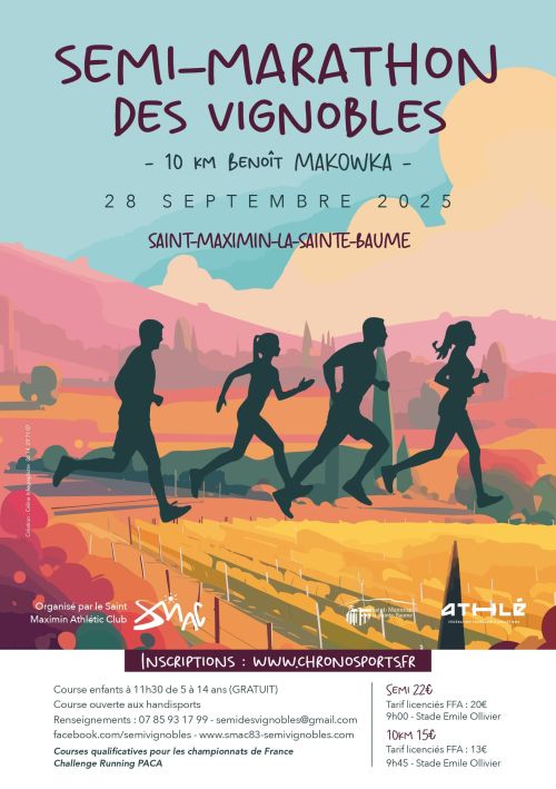 Epreuve sur route inscrite au calendrier de la Fédération Française d’Athlétisme. Parcours mesuré officiellement par la FFA. Le semi-marathon des Vignobles est le support du championnat régional PACA de semi-marathon, il accueillera donc nombre de coureurs de haut niveau. Les 2 épreuves sont qualificatives pour le championnat de France.